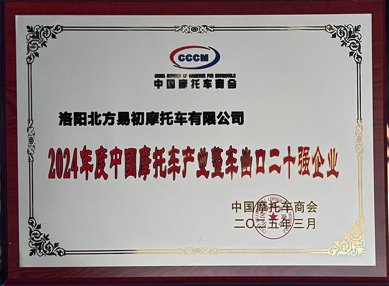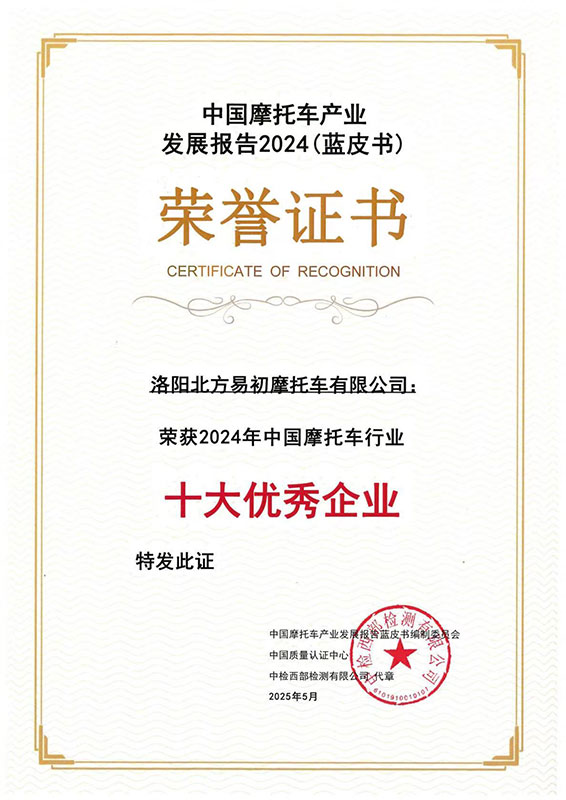 Certificate of Top 10 Advantageous Enterprises in China's Motorcycle Industry